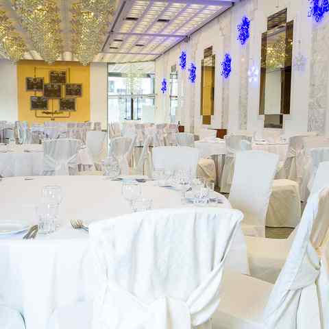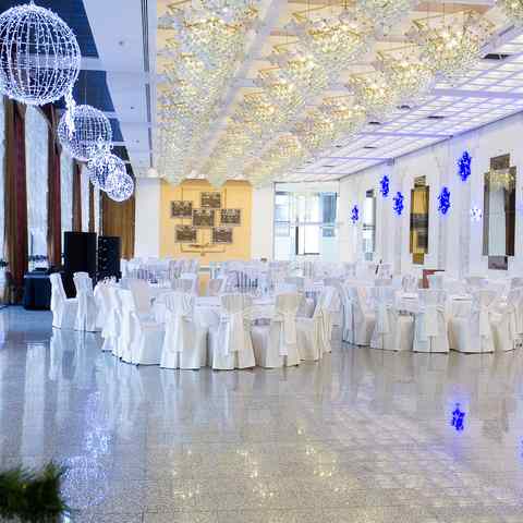 Банкетные залы Дворца Республики — это целых 3 площадки, рассчитанные на проведение масштабных корпоративов, деловых мероприятий, свадеб и других ивентов. Залы вмещают от 300 до 500 человек — и это в самом центре Минска, в богатых интерьерах с мрамором, большими зеркалами, окнами и роскошными люстрами.
